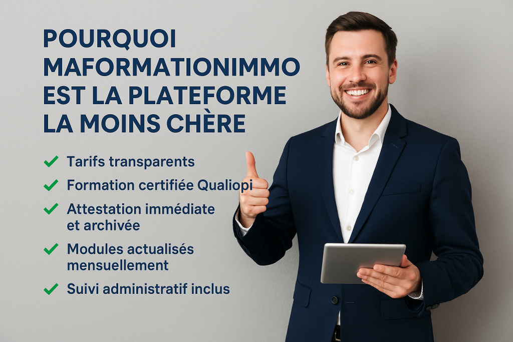 Contrairement à de nombreux organismes qui multiplient les options cachées ou les frais additionnels, MaFormationImmo affiche clairement ses tarifs :